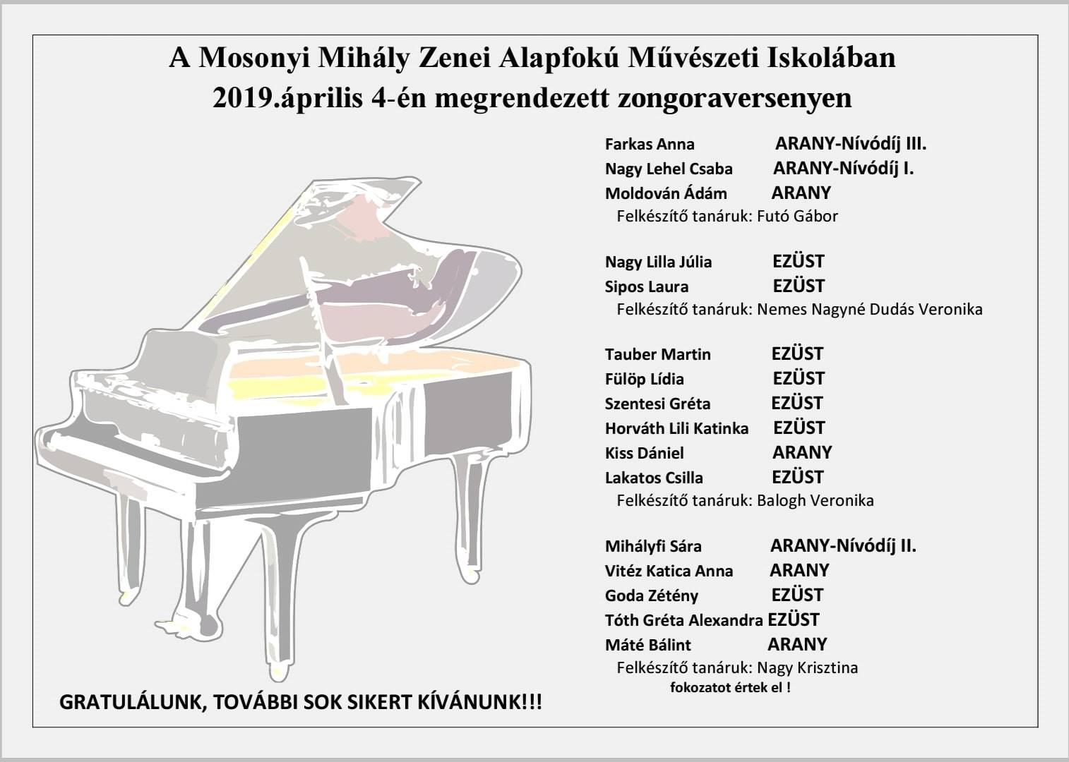 A Mosonyi Mihály Zenei Alapfokú Művészeti Iskola által 2019.április 4-én megrendezett zongoraversenyen, Jánossomorja, Csorna, Kapuvár és Mosonmagyaróvár város zongorista növendékei mutathatták meg hangszeres tudásukat a szakmai zsűrinek és természetesen egymásnak.