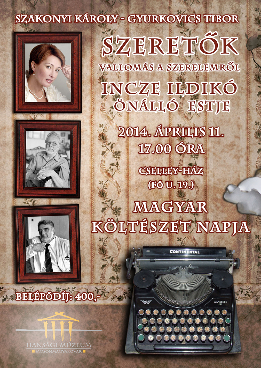 Egy asszonyi sorsot követhetünk végig Incze Ildikó előadásában 2014. április 11-én 17.00 órakor a Cselley-házban (Fő u. 19.) a Költészet Napja alkalmából.
