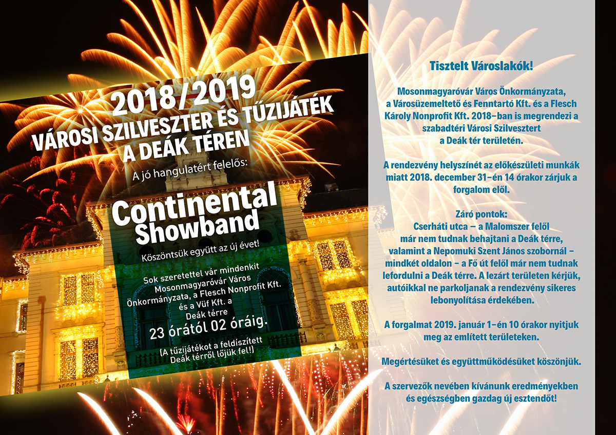 Idén is megrendezésre kerül a szabadtéri városi szilveszter a Deák téren. A rendezvény helyszínét az előkészületek miatt 2018.12.31-én 14.00 órától zárják le a forgalom elől.