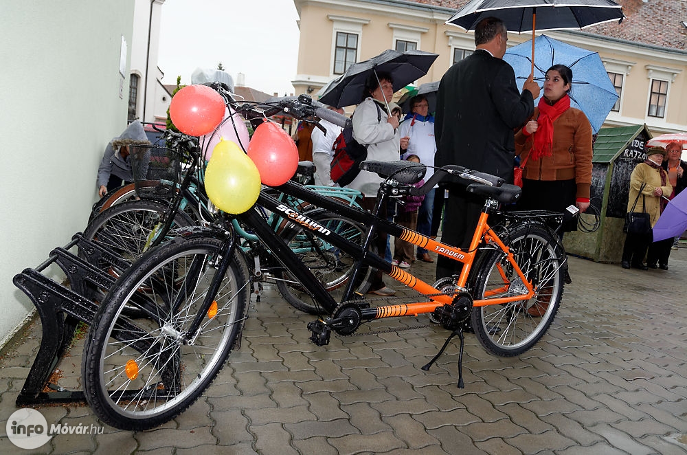 A mosonmagyaróvári Lions Club szervezésében lezajlott márciusi Vakvacsora bevételéből vásárolt tandemkerékpár is itt került átadásra a városunkban élő vakok és gyengénlátók számára.