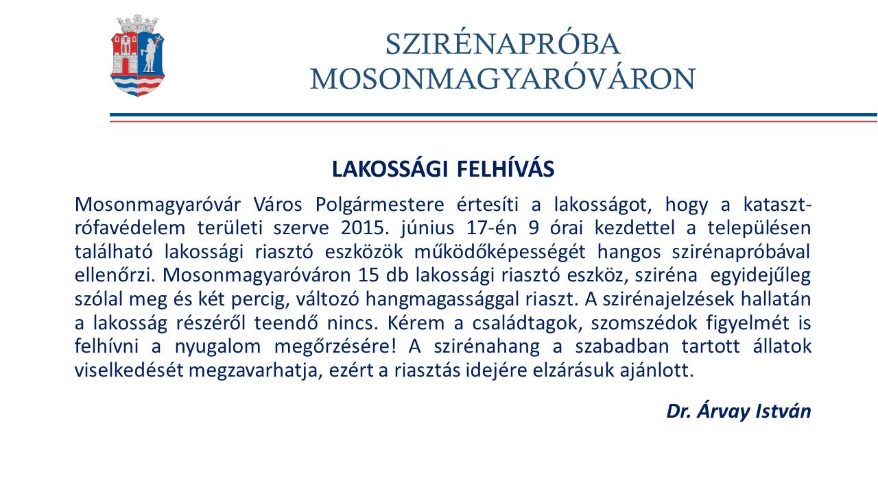 Szirénapróba Mosonmagyaróváron 2015. június 17-én 9 órától.