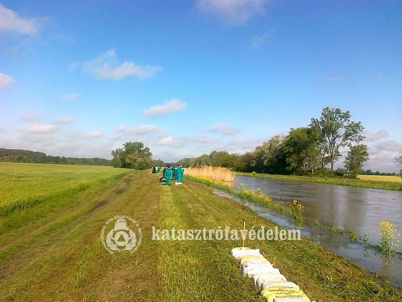 Hétfőn kora reggeltől a Szigetköz Járási Mentőcsapat is részt vesz a védekezési munkálatokban 10 fővel. A Lajta mentén Hegyeshalom és a határ közötti területen közel 1 km-es hosszon nyúlgát építése folyik a vízügyi szakemberek irányítása mellett. Jelenleg 55 fő vesz részt a homokzsákok elhelyezésében, ellátásukról a Magyar Vöröskereszt Területi Szervezete gondoskodik. Lakott területet nem veszélyeztet a Lajta, a mezőgazdasági zöld területek védelme érdekében van szükség a töltés magasítására.