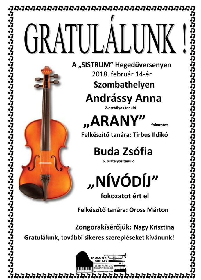 Szombathelyen, a "Sistrum" Hegedűversenyen Andrássy Anna 2. osztályos tanuló ARANYfokozatú minősítéssel tért haza - felkészítő tanára: Tirbus Ildikó -, míg Buda Zsófia 6. osztályos tanuló NÍVÓDÍJ fokaozatot ért el - felksézítő tanára: Oross Márton.Zongorakísérőjük: Nagy Krisztina