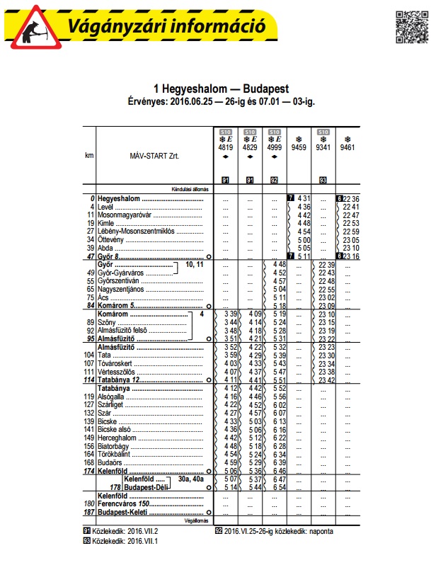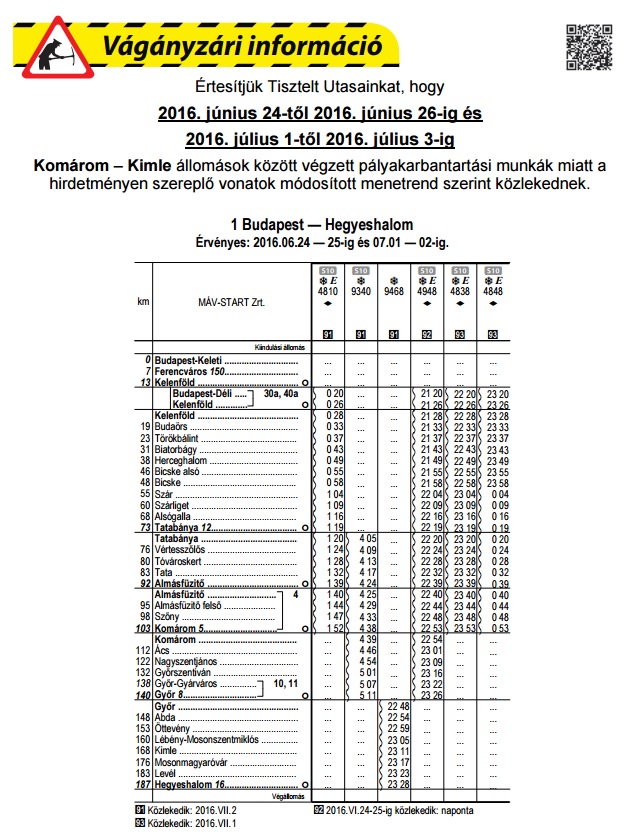 A MÁV-START Zrt. tájékoztatása szerint 2016. június 24-től 2016. június 26-ig és 2016. július 1-től 2016. július 3-ig Komárom – Kimle állomások között végzett pályakarbantartási munkák miatt a hirdetményen szereplő vonatok módosított menetrend szerint közlekednek.