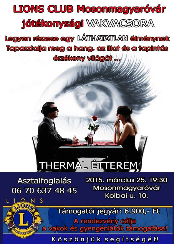 A „vakvacsora” támogatói jegyára 6900 Forint, de a Lions Club Mosonmagyaróvár szívesen veszi olyanoktól is a felajánlásokat, akik esetleg a vacsorán nem kívánnak részt venni, de támogatni szeretnék tevékenységüket.