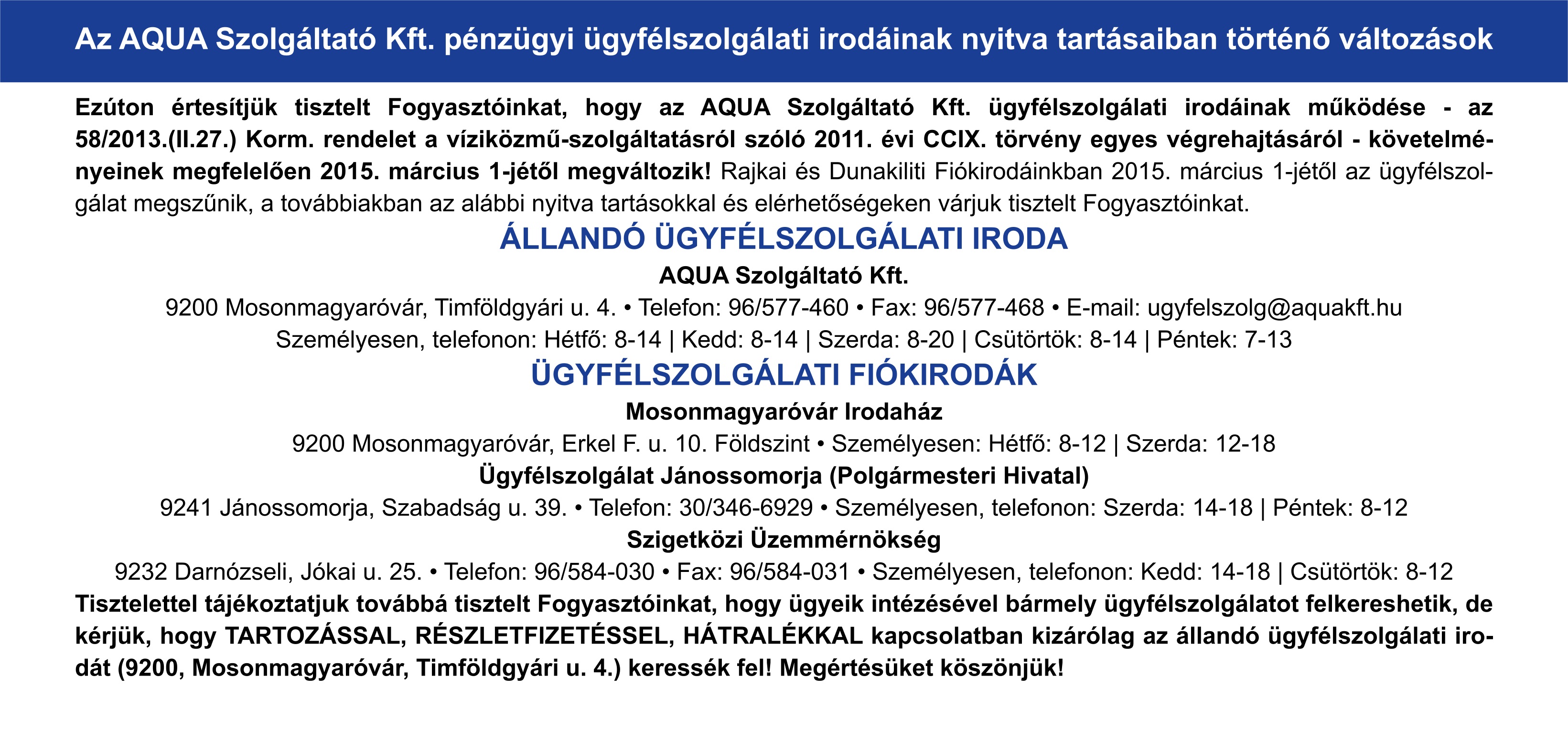 Változások az AQUA Szolgáltató Kft. ügyfélszolgálati irodáinak nyitva tartásában