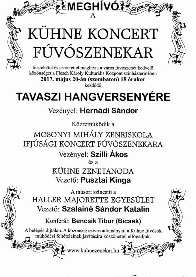A Kühne Koncert Fúvószenekar tagjai nem sokat pihentek, másnap már a mosonmagyaróvári makett kiállítás vendégei voltak, majd következik a tavaszi hangverseny, melyen vendég a helyi Ifjúsági Koncert Fúvószenekar Szilli Ákos vezényletével, és a Fantázia Majorette csoport táncoslábú lányai, Szalainé Sándor Katalin vezetésével, mely eseményre a Flesh Károly Kulturális Központban kerül sor, május 20-dikán 18 órai kezdettel.