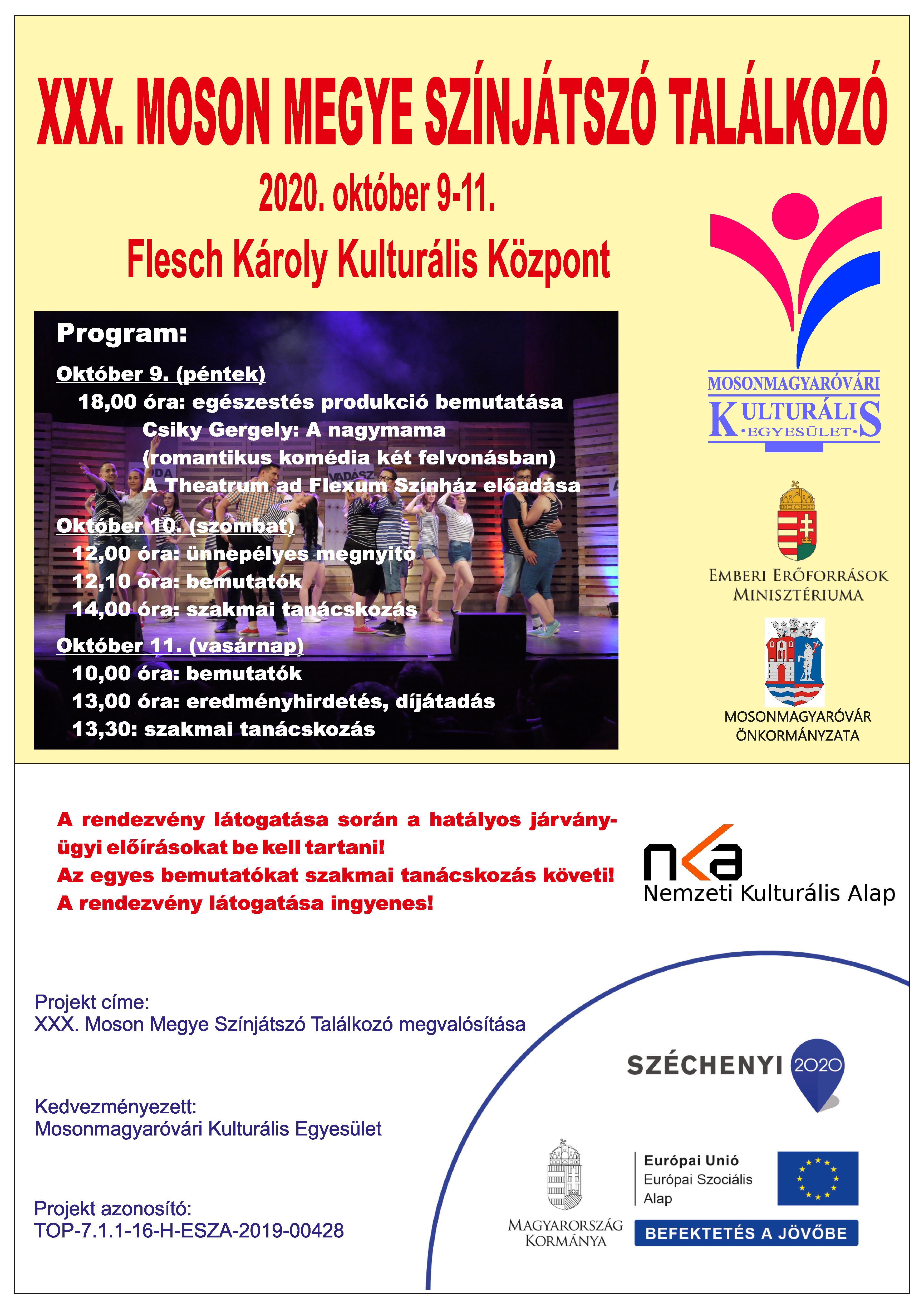 A XXX. Moson Megye Színjátszó Találkozó programot a TOP-7.1.1-16-H-ESZA-2019-00428-as számú projekt keretében az Európai Unió és az Európai Szociális Alap társfinanszírozásában szervezi meg a Mosonmagyaróvári Kulturális Egyesület. A támogatás vissza nem térítendő és 100%-os intenzitású, 3 millió, azaz hárommillió forint összegű.