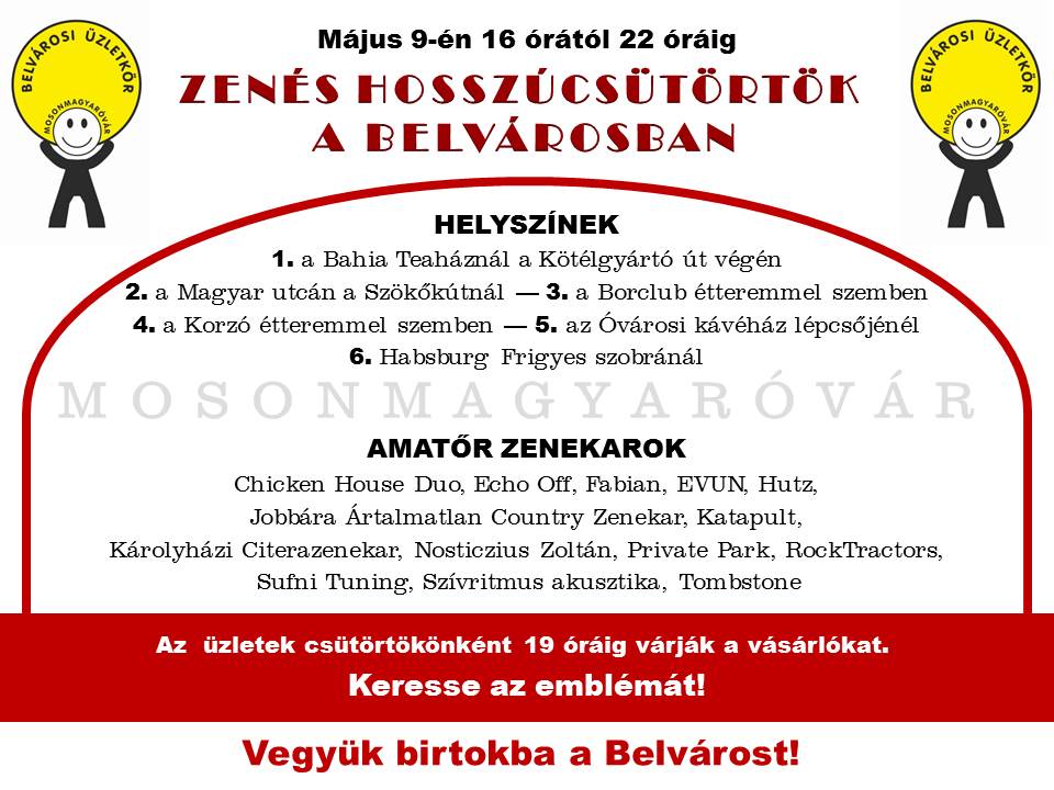 Mosonmagyaróvár patinás Belvárosa jövőjének formálása, egységes arculatának kialakítása, az infrastruktúra fejlesztése, a Magyar utca és környékének hangulatossá és mozgalmassá tétele, végső soron a vásárlók megnyerése érdekében 31 üzlet közös formációt hozott létre. A Belvárosi Üzletkör első ténykedései között szerepelt a csütörtöki nyitva tartási idők 19 óráig történő meghosszabbítása. A nagyobb vonzerő biztosítása érdekében ezeken a Hosszúcsürtökökön kulturális programokat szerveznek. Az egész nyáron át csütörtökönként működő Kult-Utca május 9-én nyit, amikor 6 helyszínen 14 amatőr zenekar szórakoztatja az érdeklődőket.